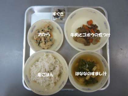 献立は,『おから』『はななのすまし汁』『牛肉とゴボウの煮つけ』『すぐき』『麦ごはん』です。