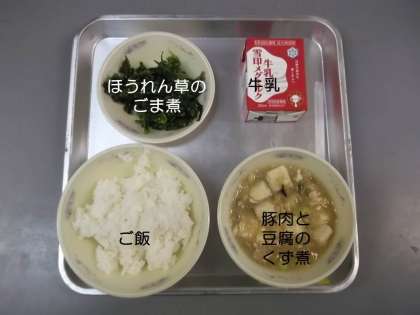 今日の献立は,『ご飯』『豚肉と豆腐のくず煮』『ほうれん草のごま煮』『牛乳』です。