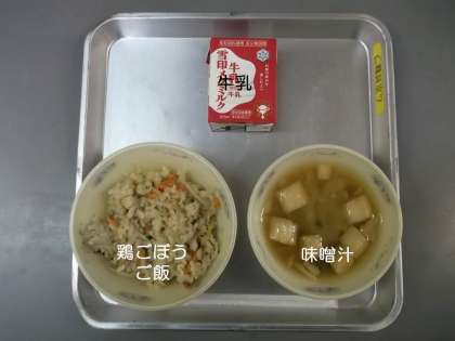 今日は『台風献立』で,『鶏ごぼうご飯』『味噌汁』『牛乳』です。