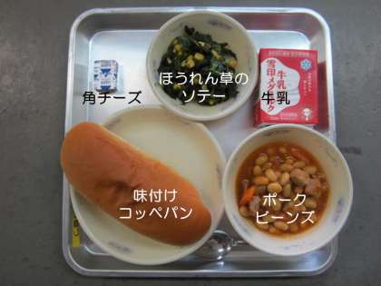 今日の献立は,『味付けコッペパン』『ポークビーンズ』『角チーズ』『ほうれん草のソテー』『牛乳』です。
