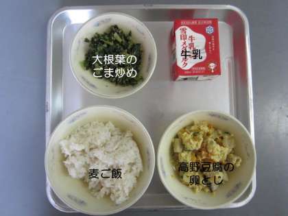 今日の献立は,『麦ご飯』『高野豆腐の卵とじ』『大根葉のごま炒め』『牛乳』です。