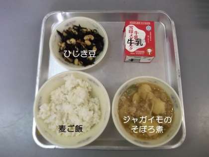 今日の献立は,『麦ご飯』『ジャガイモのそぼろ煮』『ひじき豆』『牛乳』です。