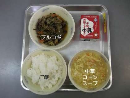 今日の献立は,『ご飯』『中華コーンスープ』『プルコギ』『牛乳』です。