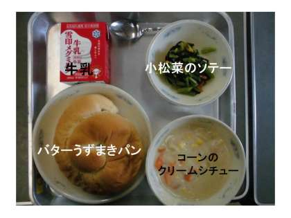 今日の献立は,『小松菜のソテー』『コーンのクリームシチュー』『バターうずまきパン』『牛乳』でした!