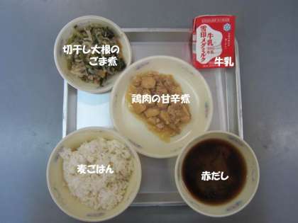 今日の献立は,『切干し大根のごま煮』『鶏肉の甘辛煮』『赤だし』『麦ごはん』『牛乳』です。