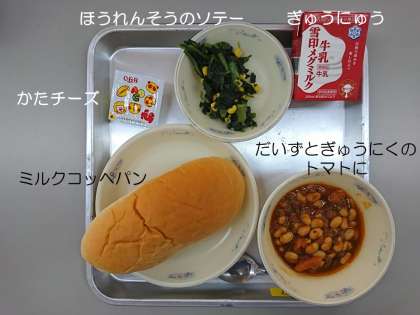 今日の献立は,『ミルクコッペパン』『だいずとぎゅうにくのトマトに』『ほうれんそうのソテー』『ぎゅうにゅう』『かたチーズ』です。