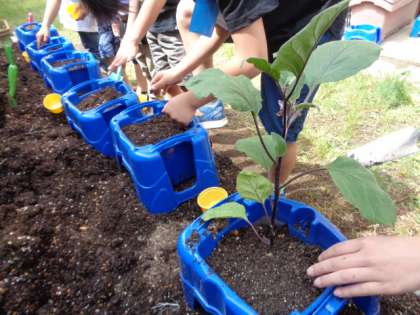 子どもたちは,植木鉢で「ピーマン」「インゲンマメ」「オクラ」「ミニトマト」「エダマメ」「シシトウ」「ナス」の中から一つを選んで育てています。