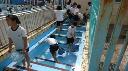 今日は,5・6校時に6年生の児童による『プール清掃』を行いました。