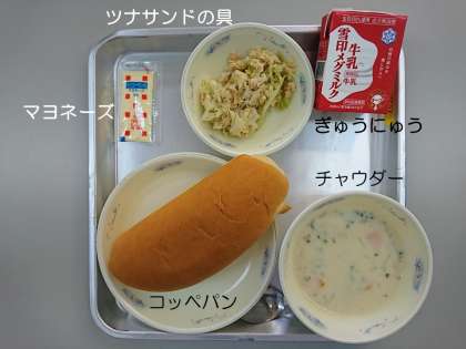 今日の献立は,『コッペパン』『チャウダー』『マヨネーズ』『ツナサンドのぐ』『ぎゅうにゅう』です。