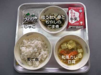 今日の献立は,『麦ご飯』『和風カレー豆腐』『じゃこ』『ほうれん草ともやしのごま煮』『牛乳』です。