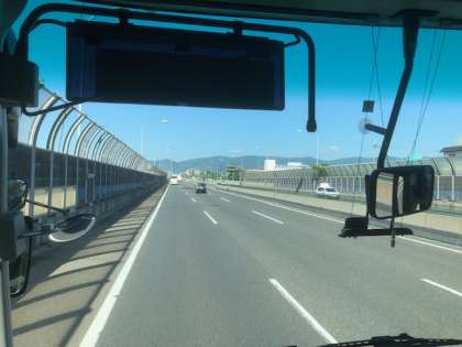 バスに乗り込み,名神高速道路を西へ向かっています。