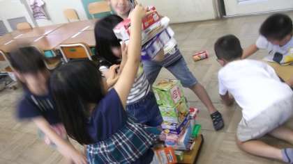 図画工作の時間に,いろいろな箱を使ってどんなことができるか考えました。