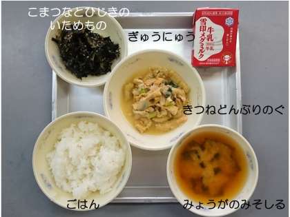 今日の献立は,『ごはん』『みょうがのみそしる』『こまつなとひじきのいためもの』『きつねどんぶりのぐ』『ぎゅうにゅう』です。
