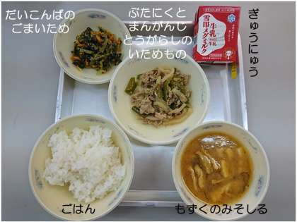 今日の給食は,「和(なごみ)献立」で,『ごはん』『もずくのみそしる』『ぶたにくとまんがんじとうがらしのいためもの』『だいこんばのごまいため』『ぎゅうにゅう』です。