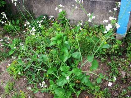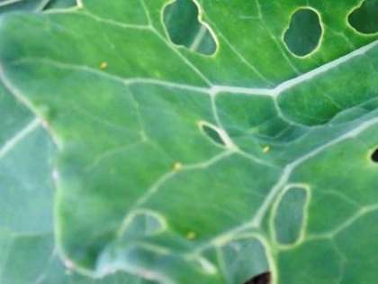 1枚目の写真はキャベツの葉です。何か黄色いとがった形のものが見えませんか?モンシロチョウの卵ですね。ずいぶん黄色なので、もうすぐ幼虫がでてきますよ。キャベツをいくつか植えているので、モンシロチョウが卵を産みにやってきます。