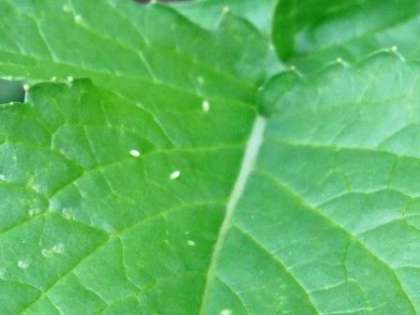 キャベツから少しはなれたところの葉にも何かついています。写真の2枚目です。何だと思いますか?さっきの卵の形と比べるとどうでしょうか?似ていますか?色は違いますね。
