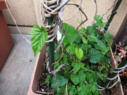 5月末か6月頃に図書室の南側の壁面を活用して、今年も「緑のカーテン」をつくる計画を立てています。これまでアサガオを中心に「緑のカーテン」を作ってきました。日本のアサガオの他、西洋アサガオを植えていましたが、その一つに「オーシャンブルー」という品種の耐寒性のあるアサガオも一鉢参加させていました。本当に寒い今年の冬でしたので、全てが枯れたような状態でした。もうだめか……と思っていましたが、写真のとおり、少しずつ育ってきています。今年もオーシャンブルーの花が楽しめるかと思うと、うれしくなってきました。