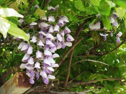 藤棚の近くでプランターなどへの散水をしていると、ブーンというクマンバチの羽音が聞こえてきました。何で飛んでいるのか、巣を作っているのかと見上げると、なんと!びっくり。フジの花がいくつか咲いています。うれしくなって数えてみると、10以上あります。うれしくなった理由は、なかなか花が見られない状態が続いていたからです。フジの木に詳しい地域の方に、以前から手入れをしていただいていました。少しずつ花が増えていくことを期待して、これからも手入れを続けていこうと思います。