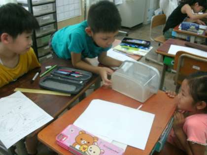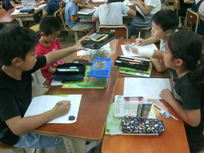 先日の理科では,まず,どんな動物(昆虫)がいるのかということを調べるため,校内をグループごとに回りました。シジミチョウや,ショウリョウバッタ,ダンゴムシなどを観察することができました。