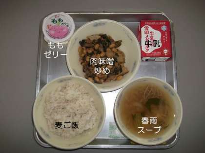 今日の献立は,『麦ご飯』『春雨スープ』『ももゼリー』『肉味噌炒め』『牛乳』です。