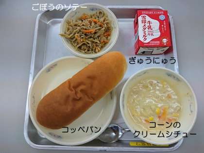 今日の献立は,『コッペパン』『コーンのクリームシチュー』『ごぼうのソテー』『ぎゅうにゅう』です。