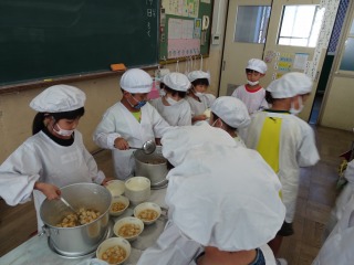 1学期にはたくさんの人にお手伝いに来てもらっていましたが,もう自分たちで配膳までできるようになりました。