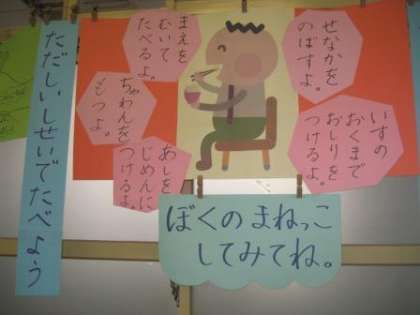 給食の時間はいつも絵を見ながら,姿勢が真似できているか自分でチェックする子どもが増えてきています。