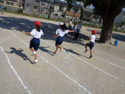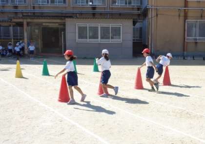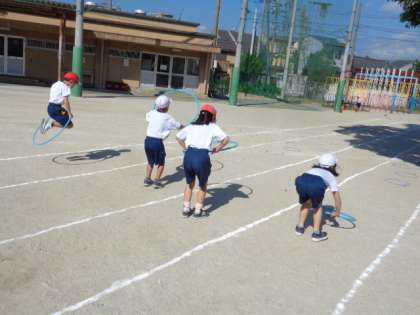 コーンはきゅっと回り,フラフープでささっと跳び,輪っかをたたんとリズムよく跳んで,ゴールを目指していました。