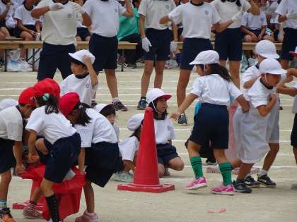 プログラムナンバー4「ふたりで なかよく レッツゴー!!」団体競技1年生です。 大きな紅白のパンツをそれぞれつないでいきます。はきかえるのに,なかなかの苦戦です。