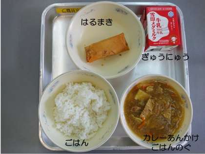 今日の献立は,『ごはん』『カレーあんかけごはんのぐ』『はるまき』『ぎゅうにゅう』です。