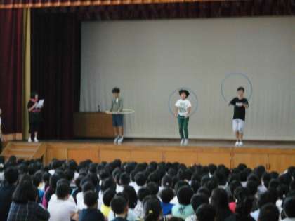 またその後に,体育委員会から「フラフープ」「ゴム」での遊びを紹介しました。いろいろな遊びを知ることで,遊びの幅が広がればと思います。