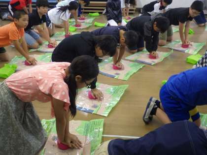 意識と呼吸の確認,AEDの使い方,胸骨圧迫(心臓マッサージ)の仕方などを実際に練習しました。