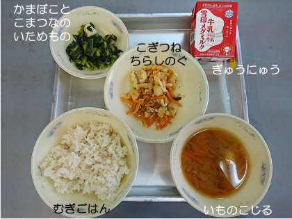 今日の献立は,『むぎごはん』『いものこじる』『こぎつねちらしのぐ』『かまぼことこまつなのいためもの』『ぎゅうにゅう』です。