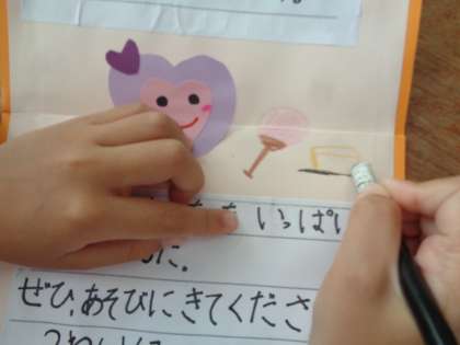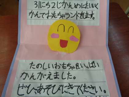1年生に日時を伝えるために,国語科『しかけカードの作り方』の学習とつなげて招待状を作りました。
