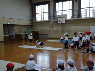 えんぴつコロコロ,かえるとび,川渡りなど,色々な動きをした後に前転の練習を行いました。