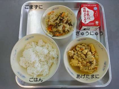 今日の献立は,「ごはん」「あげたまに」「ごまずに」「ぎゅうにゅう」です。