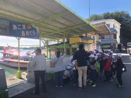 賢島に到着しました。船に乗り,さきの家を目指します。海も穏やかそうです。子どもたちは,船から見る海の景色を楽しみですね。