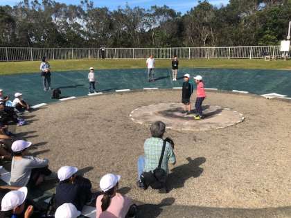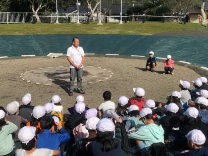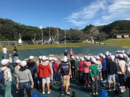 キャンプファイヤー場で,入所式を行っています。