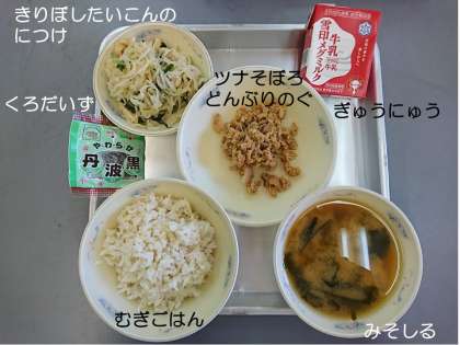 『むぎごはん』『みそしる』『ツナそぼろどんぶりのぐ』『きりぼしだいこんのにつけ』『くろだいず』『ぎゅうにゅう』です。