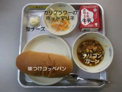 今日の献立は,『味つけコッペパン』『チリコンカーン』『型チーズ』『カリフラワーのホットマリネ』『牛乳』です。