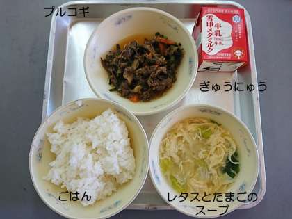 今日の献立は,『ごはん』『レタスとたまごのスープ』『プルコギ』『ぎゅうにゅう』です。