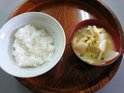 今日のお味噌汁の実は,ボリューム満点。ごはんもどんぶりに入れたくなるほど,一粒一粒が光っています。来週の花背山の家が楽しみです。