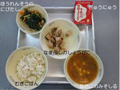 今日の献立は,『むぎごはん』『なめこのみそしる』『なまぶしのしょうがに』『ほうれんそうのにびたし』『ぎゅうにゅう』です。