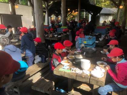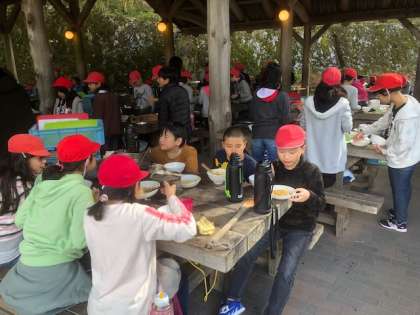 グループで作った『カレーライス』を子どもたちは笑顔でおいしそうに食べています。 どのグループも自分たちが作った『カレーライス』が一番おいしいと言って,食べています。