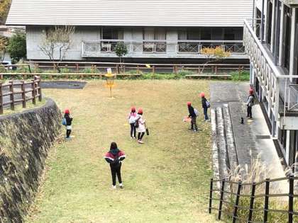 高台から,下の方の専用カゴに向けて投げるなど,『花背山の家』ならではの起伏を楽しめます。