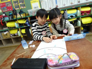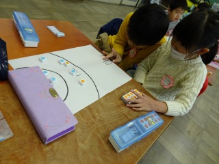 今日は,的入れゲームを行いました。10点と1点のところに入った玉の数で,何点獲得できたかを数えます。