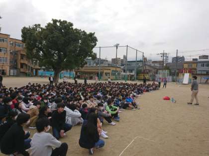 驚く子もいましたが,さっとしゃがんで身を守る姿が見られ,日頃の意識の高さを感じました。掃除時間中ですので,運動場への避難は,近く担任の先生がいませんが,あわてず「おはしもて」を意識して運動場に避難することができました。要した時間は,5分4秒と授業中に行う避難訓練と変わりませんでした。