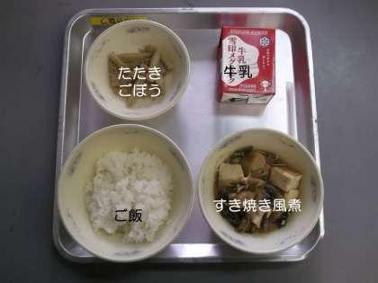 今日の献立は,『ご飯』『すき焼き風煮』『たたきごぼう』『牛乳』です。