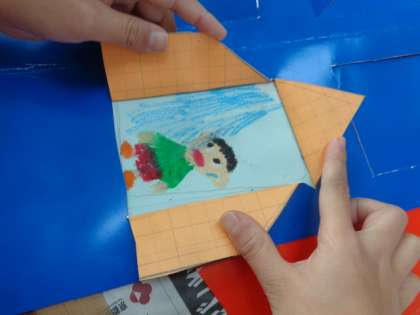 出来上がった絵は,先日切り開いたカラードフォルムに当てて,窓を開いて楽しんでいました。