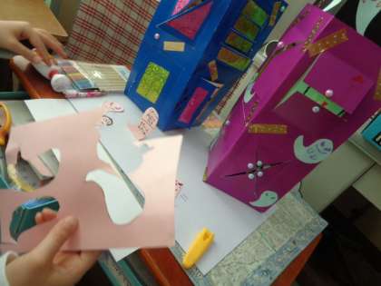 その後,台紙を作品のイメージに合うように,色紙を使ったりペンで描いたりして飾りました。